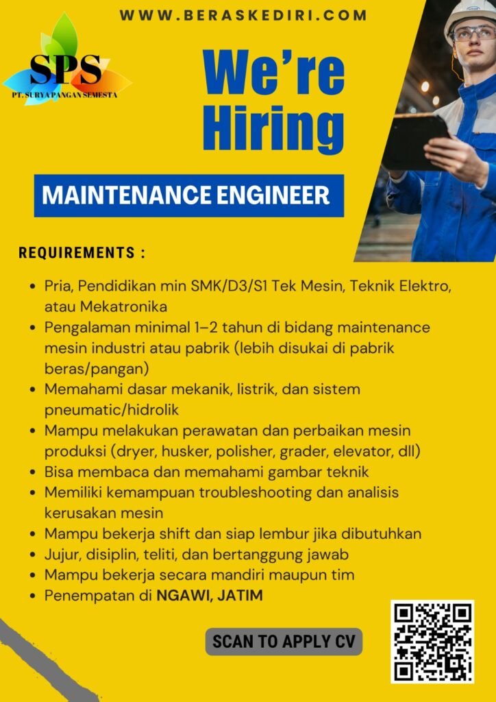 π§ Weβre Hiring β Maintenance Engineer π’ PT. Surya Pangan Semesta (SPS)π www.beraskediri.com π Requirements π¨ Pria, pendidikan minimal SMK